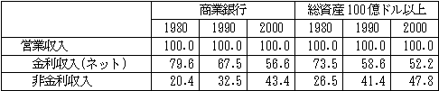 こうした非金利収入へのシフト、非金利収入の多様化により、米銀の営業収入の不安定性が小さくなったと言われることがある。しかし、実際には不安定性が縮小したのは金利収入においてであり、非金利収入においてはトレーディング収入を中心に不安定性が増している面があるとの研究もある。80年代の金利競争が銀行の体力を低下させたとの反省もあって預金金利を必ずしも市場金利に連動させないようになったこともあり、金利収入はシェアは縮小したものの比較的安定してきている。こうしたことから、いかに安定的な非金利収入源を確保していくかが一つの課題となってきている。