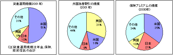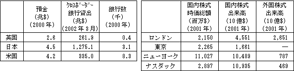 | 大陸諸国のユーロ導入等により、ロンドンの金融センターとしての地位低下を懸念する声も一時聞かれた。しかし、これまでの長い歴史で蓄積された(1)市場の開放性、(2)多数の金融機関の存在と、これによる情報の集積・流動性の確保・市場の効率性・コスト削減のためのサポートサービスの充実、(3)人的資源・サポートサービスの質の高さ、(4)オフィス環境やインフラ設備の整備、(5)技術革新、(6)英語の使用と多くの外国機関・人の進出により多言語でのアクセスも可能なこと、等の条件を備えていることから、ロンドンの世界の金融センターとしての地位は依然揺るぎないものとなっている。こうした位置付けは、10年ほど前の文献を見ても基本的に変わるところが無いようだ。 | |||