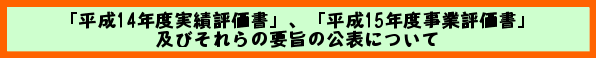 | ※ | 本文等をご覧になりたい方は、金融庁ホームページの「報道発表など」から「平成14年度実績評価書」、「平成15年度事業評価書」及びそれらの要旨の公表について(平成15年8月29日)にアクセスしてください。 |