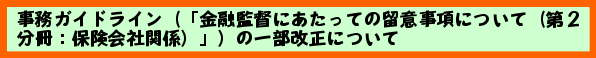 | ※ | 本文等をご覧になりたい方は、金融庁ホームページの「事務ガイドライン」から「事務ガイドラインの一部改正に関する報道発表」に入り、「第二分冊:保険会社関係」の「平成15年8月22日事務ガイドライン(「金融監督にあたっての留意事項について(第二分冊:保険会社関係)」)の一部改正について」及び「平成15年9月1日 事務ガイドライン(「金融監督にあたっての留意事項について(第二分冊:保険会社関係)」)の一部改正について」にアクセスしてください。 |