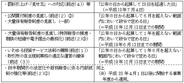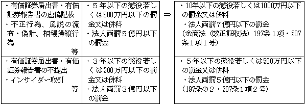 | ア) | 四半期開示の法定化 現行では取引所の自主ルールで行われている四半期開示制度を法定化し、上場会社等に「四半期報告書」の提出を義務付け、公認会計士・監査法人による監査の対象とします(金商法24条の4の7・193条の2)。四半期報告書の虚偽記載は、罰則・課徴金の対象となります。