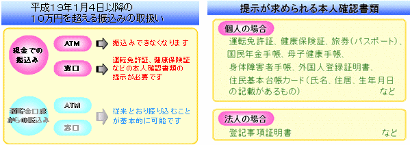 本改正が施行される平成19年1月4日以降は、現金での振込みを行う場合には10万円を超えるとATMではできなくなり、金融機関の窓口で運転免許証、保険証等の本人確認書類を提示した上で振込みを行っていただく必要があります。