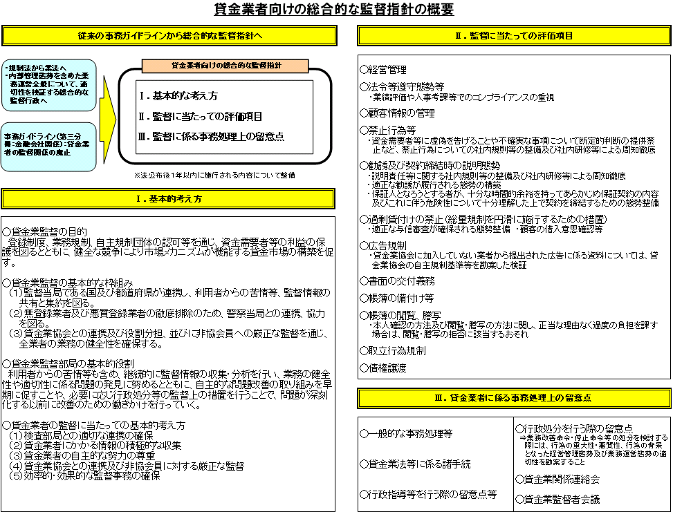 こうした法律の規定内容を踏まえ、現在の行為規制中心の貸金業監督事務ガイドラインに替えて、監督事務の基本的な考え方、評価項目、事務処理上の留意点を体系的に整理して、より多面的な評価に基づく監督を行うことを目的に本監督指針を策定いたしました。