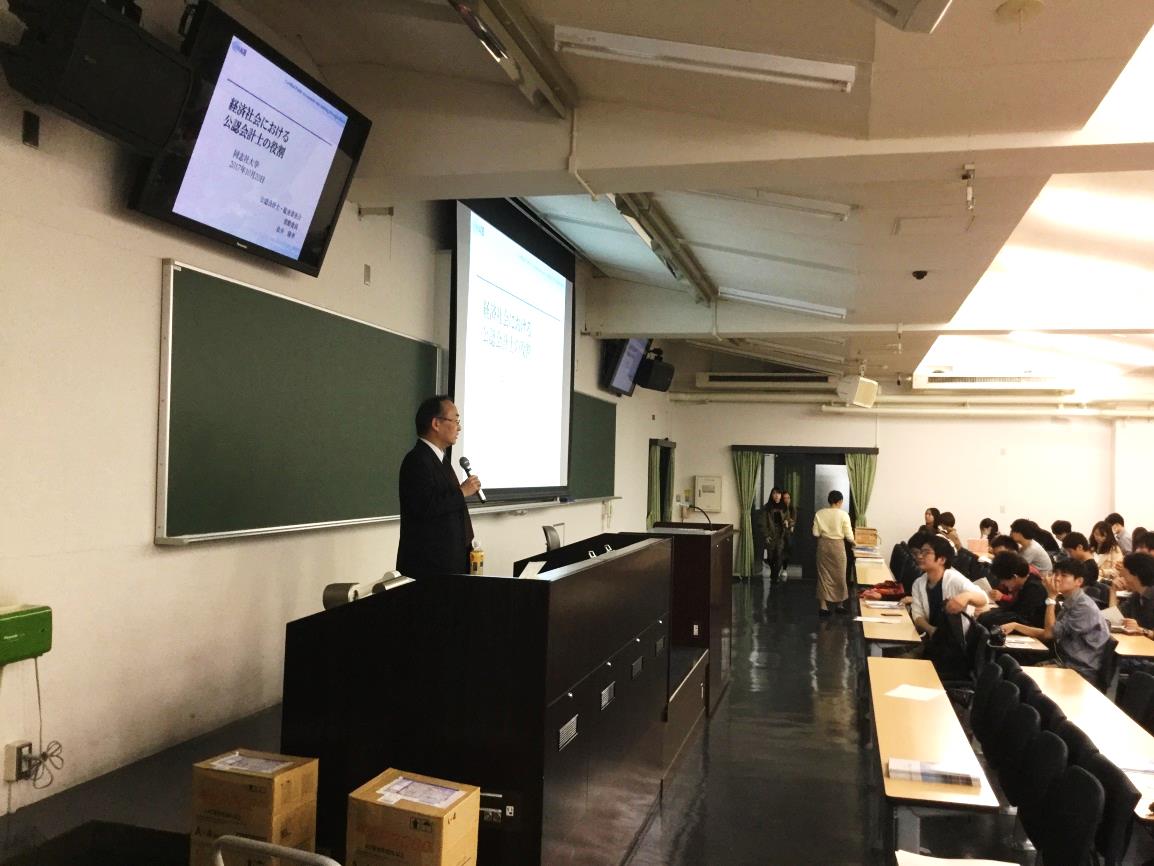 平成29年10月20日、同志社大学商学部において、松井委員が「経済社会における公認会計士の役割」をテーマとして講演を行い、多数の学生の皆さまに御出席いただきました。