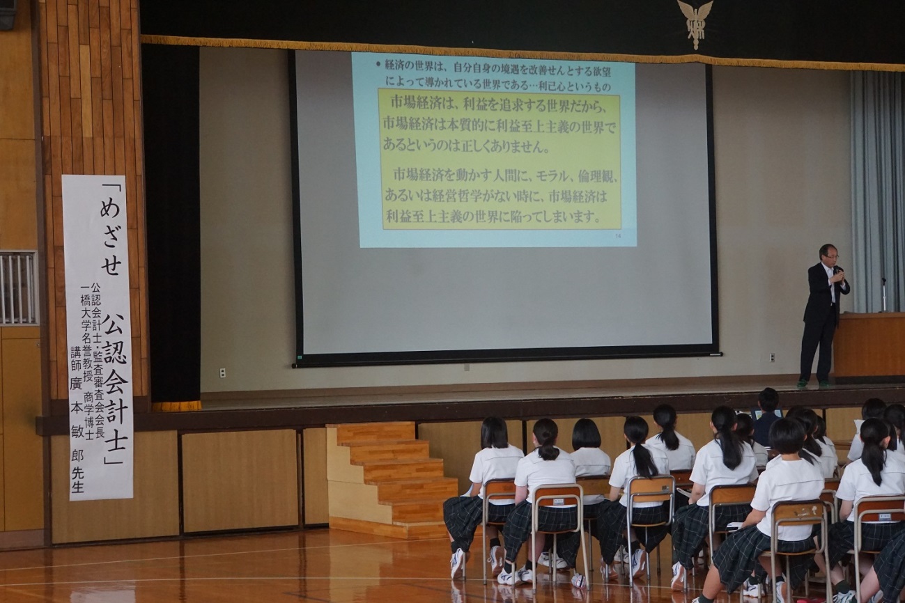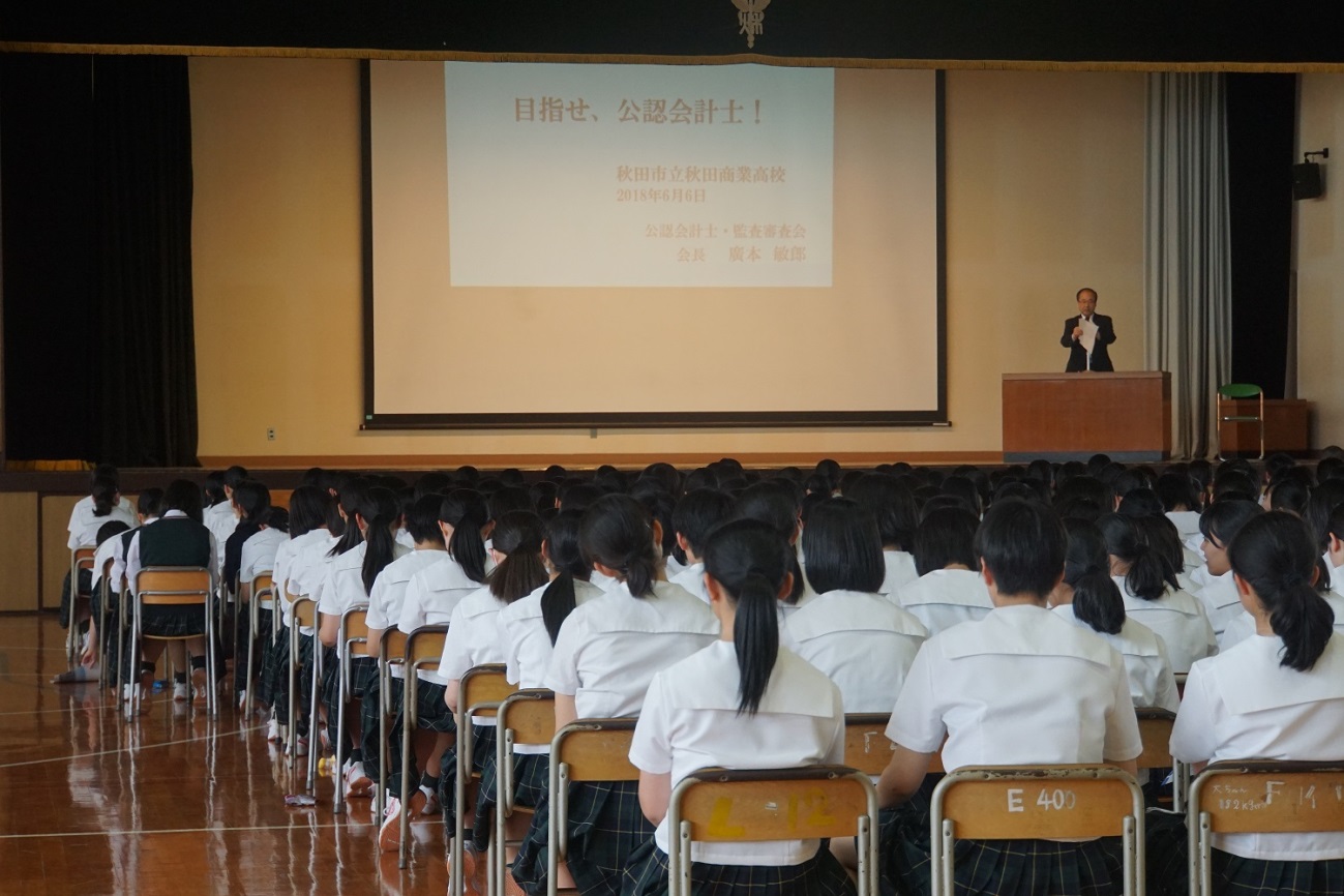平成30年6月6日、秋田市立秋田商業高校において、廣本会長が「目指せ、公認会計士!」をテーマとして講演を行い、多数の生徒の皆さまに御出席いただきました。