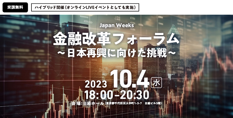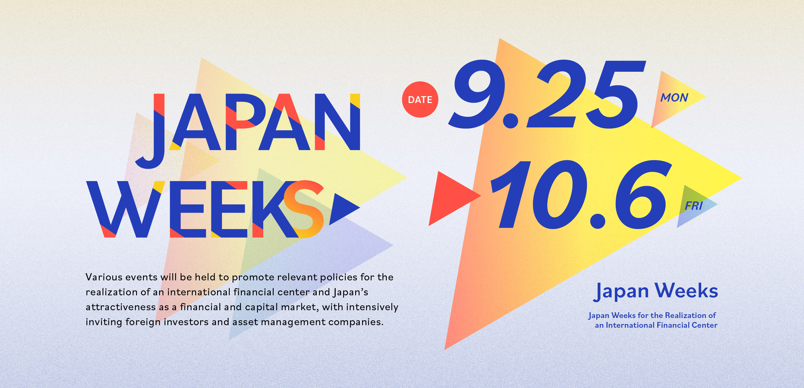 The government of Japan, in cooperation with relevant parties, will hold “Japan Weeks” from September 25 to October 6, with intensively inviting foreign investors and asset management companies, to promote relevant policies for the realization of an international financial center and Japan's attractiveness as a financial and capital market. During this period, various events will be held, including those on sustainable finance, promoting a shift from savings to investment, and promoting Japan as a leading asset management center.