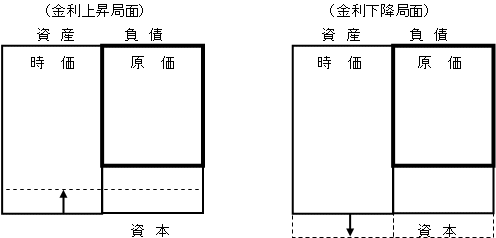 | このような資産・負債構造を有する保険会社に、1.にあげた一般企業への適用を前提とした金融商品の時価評価の基準をそのまま適用した場合、負債側の責任準備金等の時価評価が行われない一方、資産側の債券は時価評価されることとなる。このため、資産・負債のデュレーション・マッチングが図られており、資産・負債の金利変動リスクが回避されていると考えられる場合においても、資産と負債の評価方法にずれがある結果、財務諸表上、資本の額が変動し、保険会社の真の財務状況が適切に反映されないとの問題が生じることとなる。 | ||||||||||||||||||||||||||||