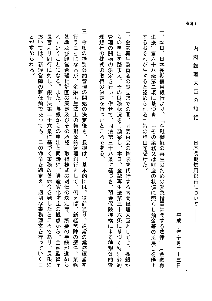平成10年10月23日 金 融 監 督 庁 長 官 談 話 1(1) 本日、日本長期信用銀行から内閣総理大臣に対して「金融機能の再生のための緊急 措置に関する法律」(金融再生法)に基づく申出があり、これを踏まえ、内閣総理大 臣は同法に基づく特別公的管理の開始の決定等を行った。 (2) 長銀の業務運営については今後も従前通り行われることになるが、資産劣化防止の 観点から、長銀から内閣総理大臣への申出と同時に、当庁より同行に対し、銀行法第 26条に基づく業務改善命令を発した。長銀においては、この命令を踏まえ、適切な 業務運営を行っていくことが求められる。 (3) さらに、当庁としては、今般の長銀に関する決定の内容等が、内外の市場関係者に 正確に理解されるよう、大蔵省、日本銀行とも協力して、海外の関係当局に十分な説 明を行うなどの努力を行っていきたいと考えている。 2(1) また、本日、「金融機能の早期健全化のための緊急措置に関する法律」(早期健全 化法)が施行された。これを受け、内閣総理大臣から、同法を真に実効性のあるもの として機能させるために、明確なルールに基づく公正な金融行政という枠組みのなか で、早期健全化法との効果的連携を図るために検査監督上必要な措置を迅速に講じる ようにとのご指示を頂いた。 (2) 当庁としては、この内閣総理大臣のご指示を踏まえ、我が国金融システムの早期健 全化のため、検査、モニタリングの強化と早期是正措置の厳正な運用などの監督権限 の適切な行使を通じ、個々の金融機関の経営の健全化を図り、もって預金者等の保護 と信用秩序の維持、内外の金融市場の安定性確保に万全を期して参りたい。