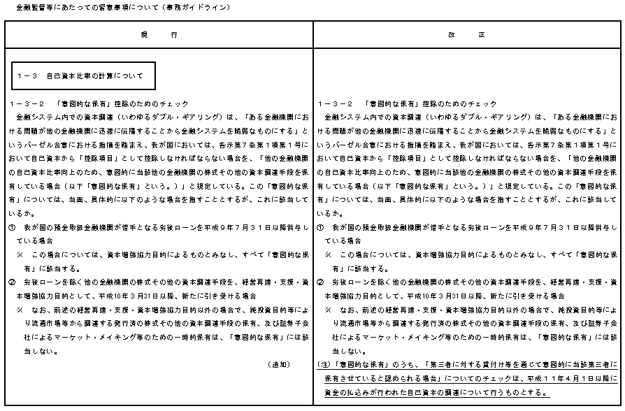 平成11年4月16日付でパブリックコメントに付しました標記については、5月14日をもってコメントを締め切らせていただきました。いただいたコメントに対する回答・対応は以下のとおりです。御協力ありがとうございました。なお、改正告示及び関連する事務ガイドラインの発出は明日(5月21日)の予定です。(別添参照)