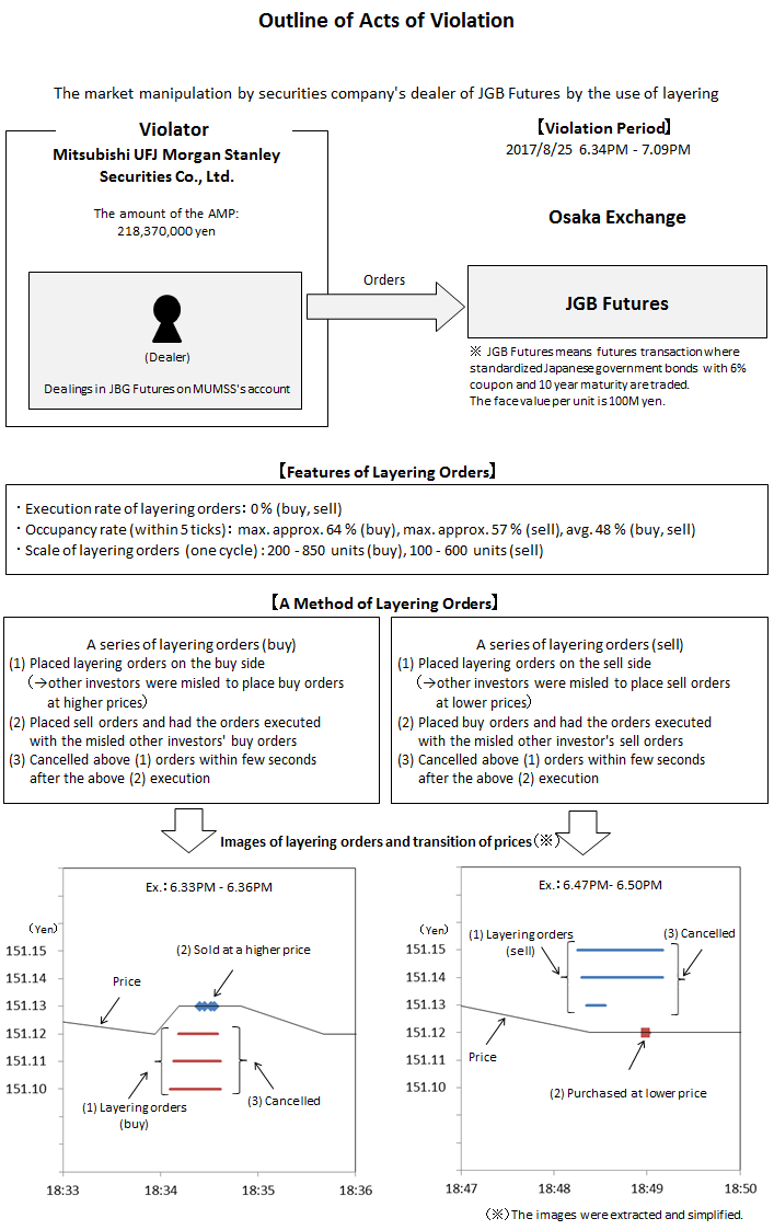 MUMSS is a stock company that is registered with the Commissioner of the Kanto Local Finance Bureau as a Type I Financial Instruments Business operator. MUMSS, through its employee who engaged in dealing, in relation to its business, regarding 10-year Japanese Government Bond Futures, September 2017 (“10-year JGB Futures”), which was listed on Osaka Exchange, Inc. (“Osaka Exchange”), from 6:34 PM to 7:09 PM on August 25, 2017 as described in the Appendix, with the purpose of inducing Market Transactions of Derivatives of other market participants, without intention to execute, placed buy orders for 6,253 units and sold 177 units by placing a large amount of buy orders at the best bid price and below, and placed sell orders for 1,844 units and bought 158 units by placing a large amount of sell orders at the best offer price and above, on the Osaka Exchange. These transactions constituted a series of Market Transactions of Derivatives and offers that would mislead other investors into believing that Market Transactions of Derivatives were thriving and would cause fluctuations in the market of 10-year JGB Futures.