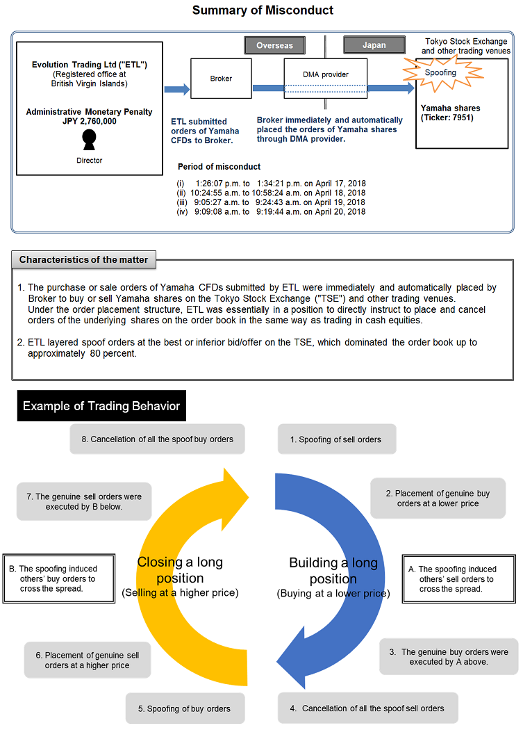 Evolution Trading Ltd (“ETL”), a company incorporated in the British Virgin Islands, traded contracts for difference (“CFDs”), whose underlying assets were Japanese stocks, with an overseas securities broker (“Broker”). On receipt of the order from ETL, the Broker in turn immediately and automatically placed an order to buy or sell underlying shares on the Tokyo Stock Exchange (“TSE”) and other trading venues through a direct market access provider. (Note: Under the order placement structure, ETL was essentially in a position to directly instruct the orders to buy or sell the underlying shares on the order book. The summary of misconduct is shown in Chart.)