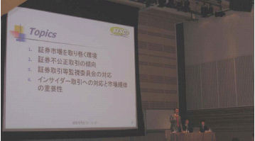 講演では、まず佐々木総務課長から、風説の流布やインサイダー取引等の、証券市場の混乱に乗じた不公正取引のリスク、また、不正会計及び上場維持のための株価操縦等、実態経済の悪化に伴う不公正取引のリスクなどを踏まえ、証券監視委の対応について説明したほか、他の2名から、インサイダー取引の未然防止や課徴金制度の対象行為等について説明を行いました。